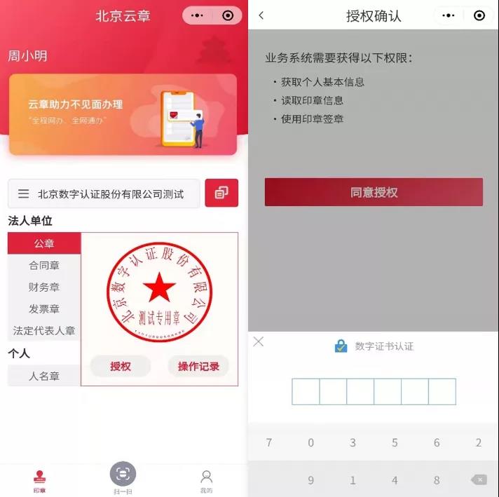 银河官网根据《电子签名法》《密码法》《国务院关于在线政务服务的若干规定》和国务院办公厅《全国一体化在线政务服务平台电子印章管理办法(试行)》等法律法规和文件规定,为平台提供基于国产密码算法的电子签章。电子印章存储在云端,企业法人通过微信小程序即可轻松完成印章申请,同时,可对电子印章灵活授权使用与管理,突破了传统实体印章用章难、管章难、验章难的瓶颈,使得“随时随地随签”的移动端签章成为可能。此外,平台与北京市公安局实物印章治安管理信息系统互联互通,确保电子印章的统一备案,实现电子印章“物电同源、同章同模”,确保了企业使用电子印章的安全可信。