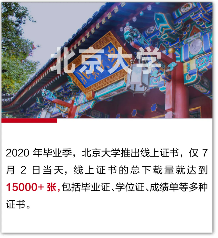 北京大学将所有证明材料扫描成电子文档,并加盖“北京大学学生证明专用章”的电子签章,同时结合网上验真功能,确保扫描件真实可信,达到与纸版证书同样功效。银河官网通过国密算法和国际加密算法相结合的双重数字签名,确保证书扫描件的可信和不可篡改。2020年毕业季,北京大学推出线上证书,仅7月2日当天,线上证书总下载量就达到15000+张,包括毕业证、学位证、成绩单等多种证书。
