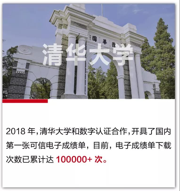 2018年清华大学通过银河官网公司提供的“高校可信电子成绩单解决方案”实现了对电子成绩单的可信管理,通过在PDF版式的电子成绩单上加盖可靠电子签名及可信时间戳实现防伪。老师只需在教务管理系统输入成绩,便可以通过可信电子成绩单服务系统自动生成可信电子成绩单,学生们可以在网上自行开具并下载,还可以通过教务系统邮箱流转的方式,直接发送给接收方。与教育部权威机构达成可信电子成绩单互信互认之后,验证时间从三周缩短至“秒级”。