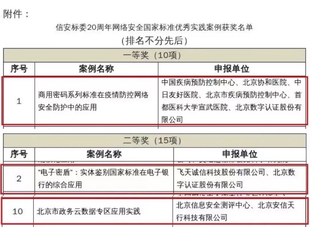 日前,“网络安全国家标准20周年优秀实践案例评选活动”获奖名单正式对外公布。经过主办方全国信息安全标准化技术委员会(以下简称“信安标委”)的专业评审和激烈角逐,北京银河官网股份有限公司(以下简称“银河官网”)申报的《商用密码系列标准在疫情防控网络安全防护中的应用》荣获一等奖,此外《“电子密盾”:实体鉴别国家标准在电子银行的综合应用》以及子公司北京安信天行科技有限公司《北京市政务云数据专区应用实践》分别荣获二等奖。不论是获奖数量,还是奖项含金量,均位列本次入围单位前列。