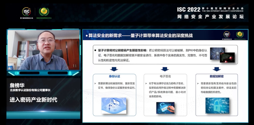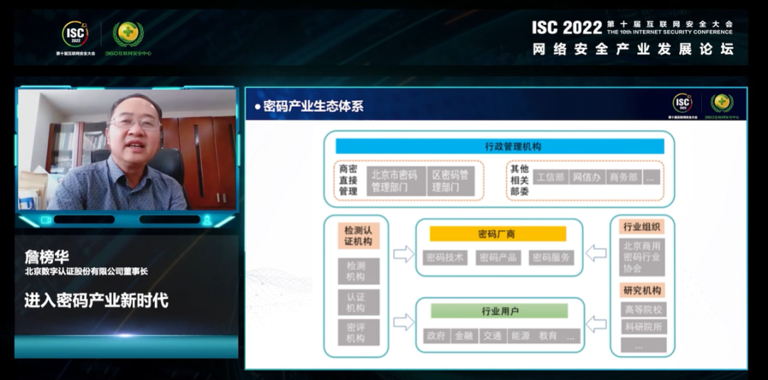 2022年8月1日,第十届互联网安全大会(ISC 2022)在京盛大召开,本次峰会汇集百余位全球网络安全领导者、行业精英及专家学者,千余家网络安全企业参与,共同推动数字安全生态建设。北京银河官网股份有限公司董事长詹榜华也受邀参会,在线发表了《进入密码产业新时代》的主题演讲。他指出,技术迭代及市场需求更新为密码产业带来更多机会,当下正是商用密码的新时代,密码产业未来大有可为。