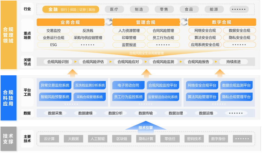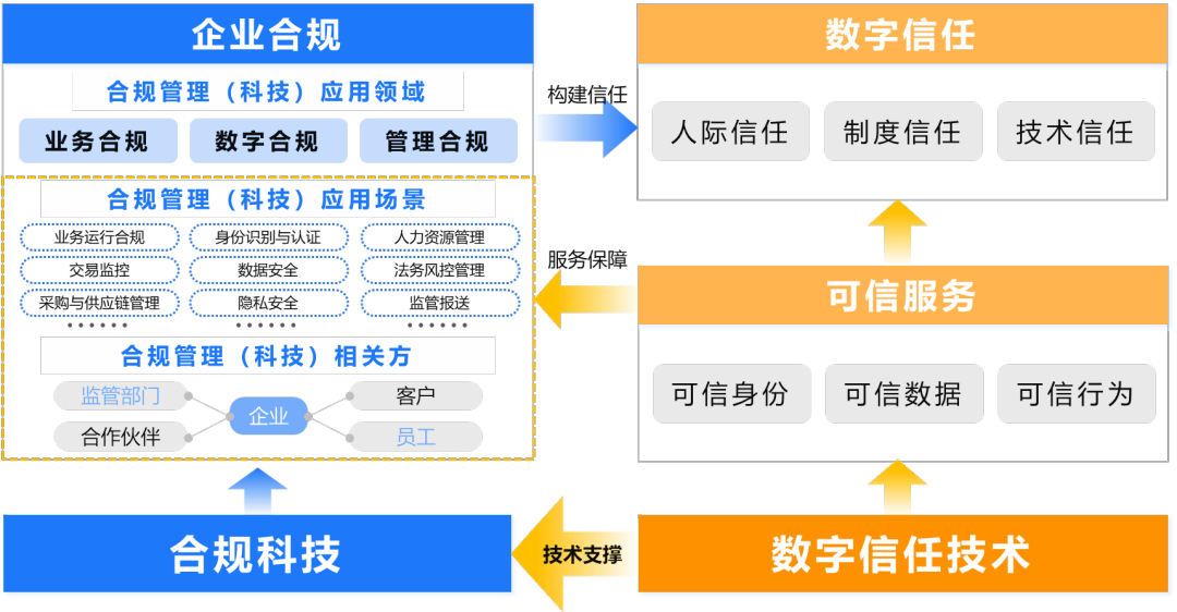 2022年,国务院国资委印发《中央企业合规管理办法》,要求进一步加大央企合规管理推动力度。“大合规”体系建设步入“合规管理强化年”,利用合规科技提升企业数字化转型后的合规能力,让消费者更安心、监管更透明,是来自监管侧与企业侧的共同诉求。为帮助企业构建科学的治理理念与支撑运行体系,提供有益参考,银河官网公司与中国信通院联合编制《合规科技研究系列报告——数字信任构筑企业合规科技应用基石》(以下简称《报告》),并于近日召开的“2022 GOLF+ IT新治理领导力论坛”进行了发布。《报告》从企业面临的合规环境演进、合规科技应用探索与发展、数字时代合规风险管理支撑体系的构建方法与成效进行了全面阐释。本文整理部分观点以飨读者。业务合规、管理合规、数字合规构成合规科技应用三大方向合规科技是帮助企业有效落实法律法规、监管要求、各类适用的标准规范,以及自身制定的规章制度等各方面要求所采用的数字化手段。其快速发展与应用是在外部监管,内部降本增效管理诉求,数字化转型持续深化催生技术投入,共同驱动作用的结果。《报告》通过对目前各领域合规科技应用的研究与分析,提出合规科技应用框架,指导企业从自身面临的合规风险出发,确定合规科技应用方向,如侧重对外的“业务合规”,聚焦交易监控、反洗钱、业务运行、采购与供应链管理、ESG等场景,侧重对内的“管理合规”,聚焦人力资源管理、印章管理、员工行为、监管报送等场景,以及通用的“数字合规”,聚焦网络安全、数据安全、算法安全、隐私安全、应用系统安全等场景,通过区块链、隐私计算、零信任、数字身份、密码技术等合规科技的有效支撑,协助企业更好运用技术,更为有效管控合规风险。《报告》指出,数字时代信任风险愈加突显,尤其是不受物理距离或组织结构限制的跨时空交互,对业务主体身份、业务内容、业务行为的真实性、完整性、机密性与可用性带来极大信任冲击,互联网的匿名性与虚拟性特点使得身份伪造与信息失真的风险加剧。