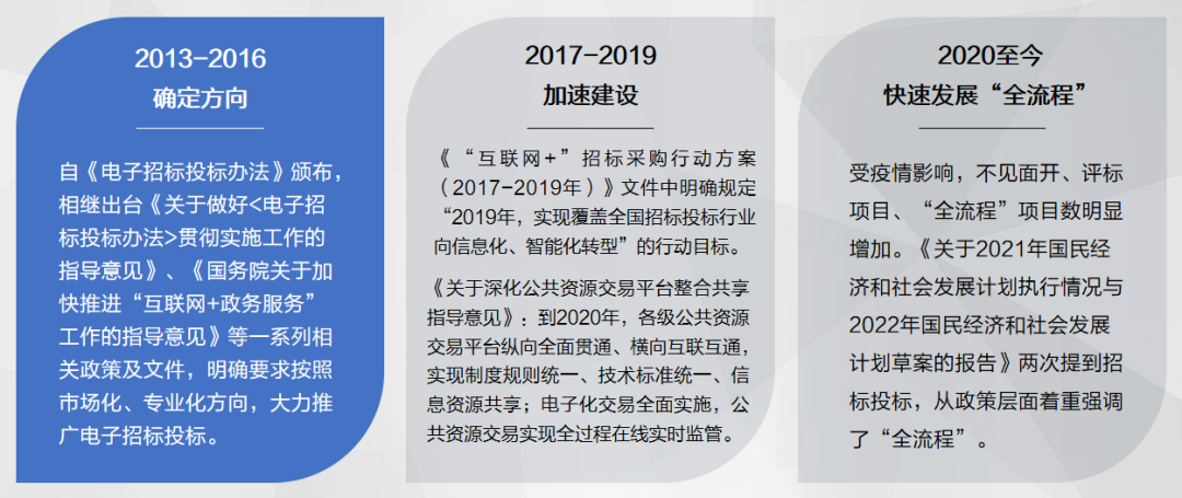 从行业整体发展来看,电子招投标主要经历了“确定方向”“加速建设”“快速发展‘全流程’”三个关键阶段。作为电子招投标平台建设亲历者,中招联合实施总监赵学真颇有感触,“受疫情影响,2020年至今,不见面开、评标项目,全流程电子化招投标项目在明显增加。”今年8月初,“依法必须招标项目应当实行全流程电子化交易”再次写入国家发改委等13部门印发的《关于严格执行招标投标法规制度进一步规范招标投标主体行为的若干意见》。
