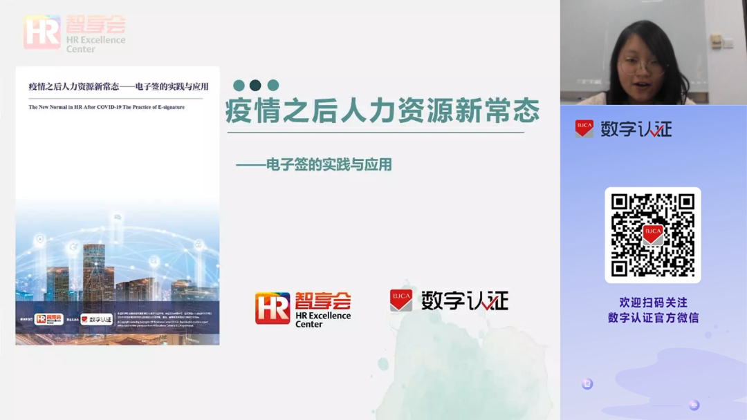 发布会上,作为调研报告的作者之一,智享会专家顾问方麻迪从撰写背景、主要发现、案例解读三方面对报告内容进行了详细梳理。她表示,人力资源数字化转型的大趋势对电子签而言是长期的推动因素,而2020年暴发的疫情让企业有了更为迫切的“无接触”“远程办理业务”的诉求。作为行业内首部关注人力资源电子签企业实践效果的调研报告,通过详实的调研数据和案例实践,此报告可为企业应用电子签提供重要参考。