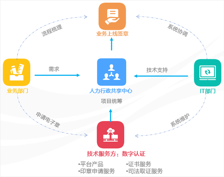 在这种集中式管理的项目运作模式下,人力行政共享服务中心对企业数字化转型的贡献凸显:既要对电子签章服务平台的推广上线集中管理,电子印章集中管理,还要统一项目规划,制定推进计划(如每年度哪些业务系统要与电子签章服务平台拉通),全场景推进,由易到难分步实施。具体到每个业务场景电子签的实施工作,从业务调研、流程梳理到方案制定,均由中心去联动IT部门、业务部门,以及技术服务方银河官网一起评估,灵活实现不同业务场景的扩展应用。